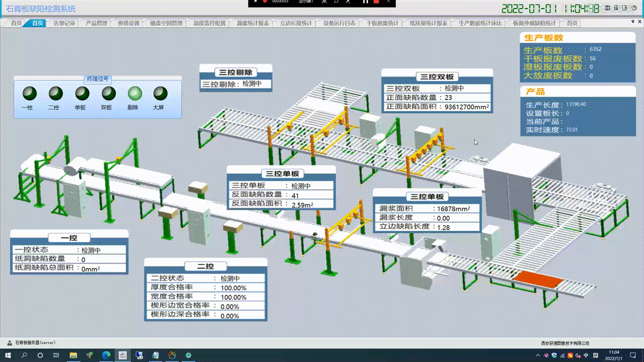 石膏板中央服務(wù)器采用網(wǎng)絡(luò)通訊、數(shù)據(jù)庫(kù)等技術(shù),可以自動(dòng)獲取石膏板質(zhì)量在線(xiàn)檢測(cè)系統(tǒng)的所有數(shù)據(jù),進(jìn)行設(shè)備管理、人員管理和產(chǎn)品管理,能夠自動(dòng)生成各種報(bào)表,自動(dòng)統(tǒng)計(jì)和分析生產(chǎn)質(zhì)量數(shù)據(jù),為生產(chǎn)和工藝改進(jìn)提供有力的數(shù)據(jù)支撐。