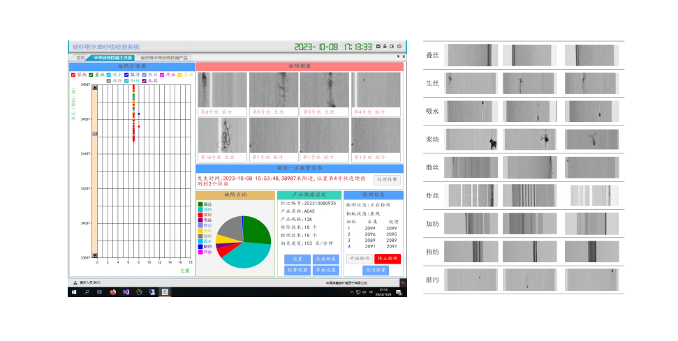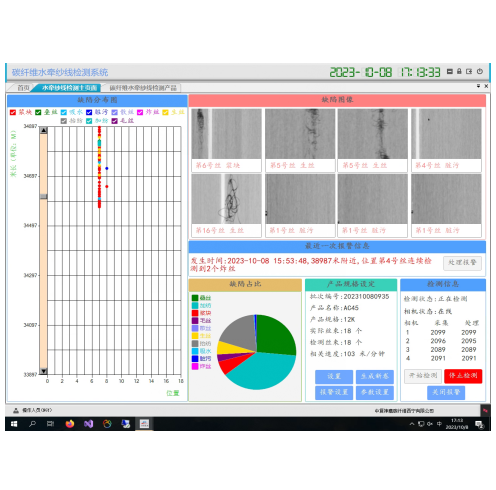 1.檢測缺陷:斷絲、疊絲、漿塊、生絲、炸絲、臟污、散絲、絲束寬度;根據(jù)工藝設(shè)定標準及時進行異常報警;