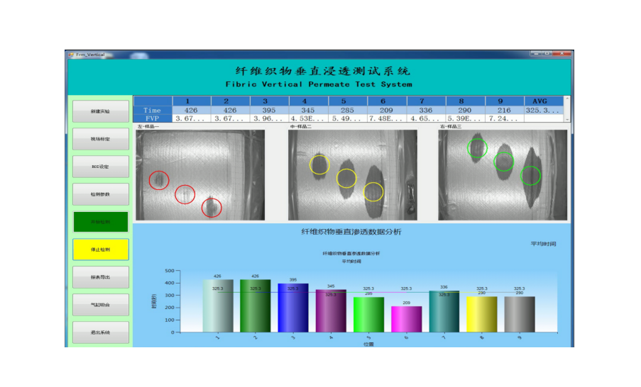 設(shè)計檢測平臺可以正反面轉(zhuǎn)動,其上共有9個監(jiān)測點(diǎn),采用機(jī)器視覺技術(shù),檢測到透濕點(diǎn)后,對9個點(diǎn)的變化進(jìn)行連續(xù)檢測,連續(xù)給出變化的數(shù)據(jù),進(jìn)行實(shí)時圖像處理。